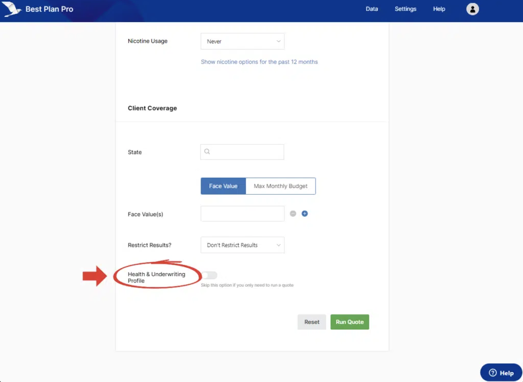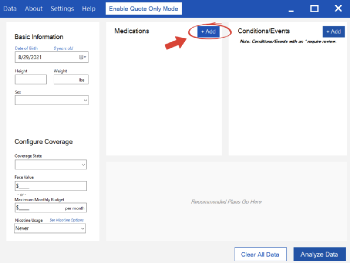 To add a medication, toggle on the Health & Underwriting Profile to open the Health & Underwriting Wizard.