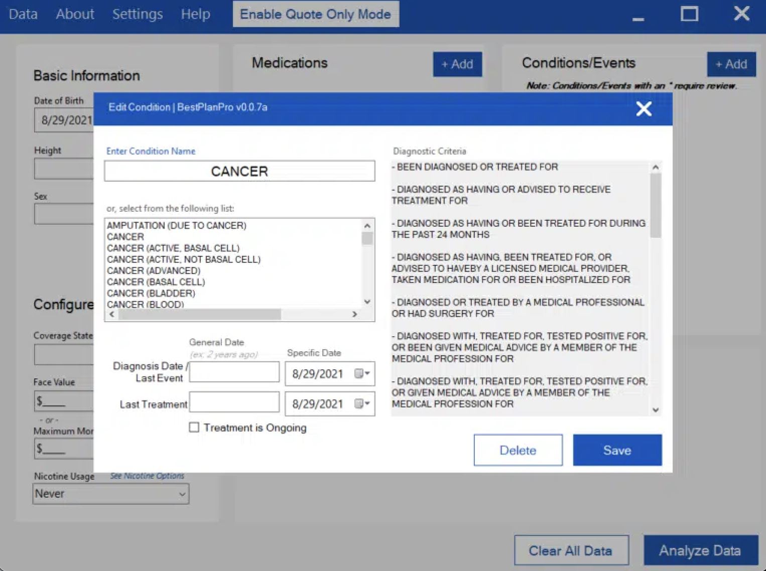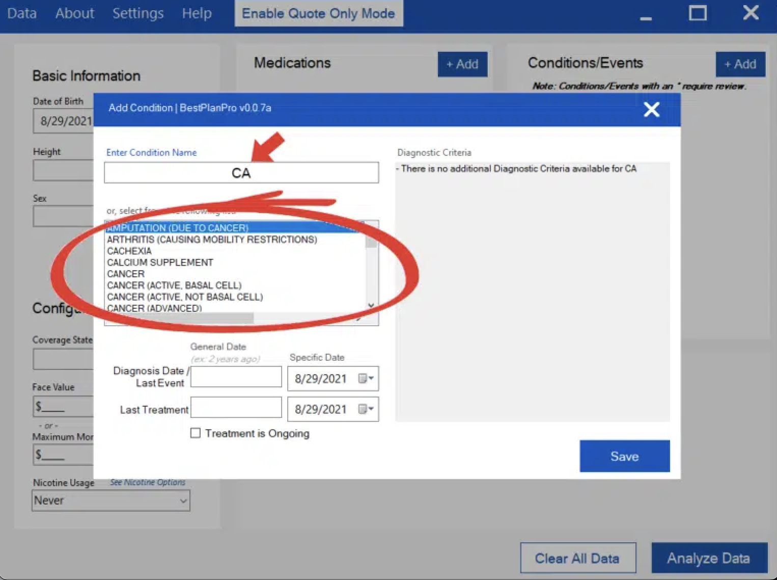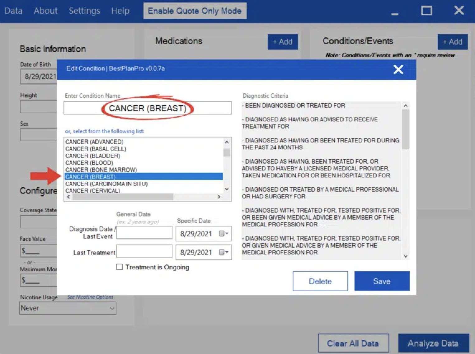 Through Conditions, type the name of the condition youโre looking for. BPP will search its database to help you find the correct one. You can also override the software to enter conditions that donโt appear in BPP. Afterward, make sure all the dates are correct.