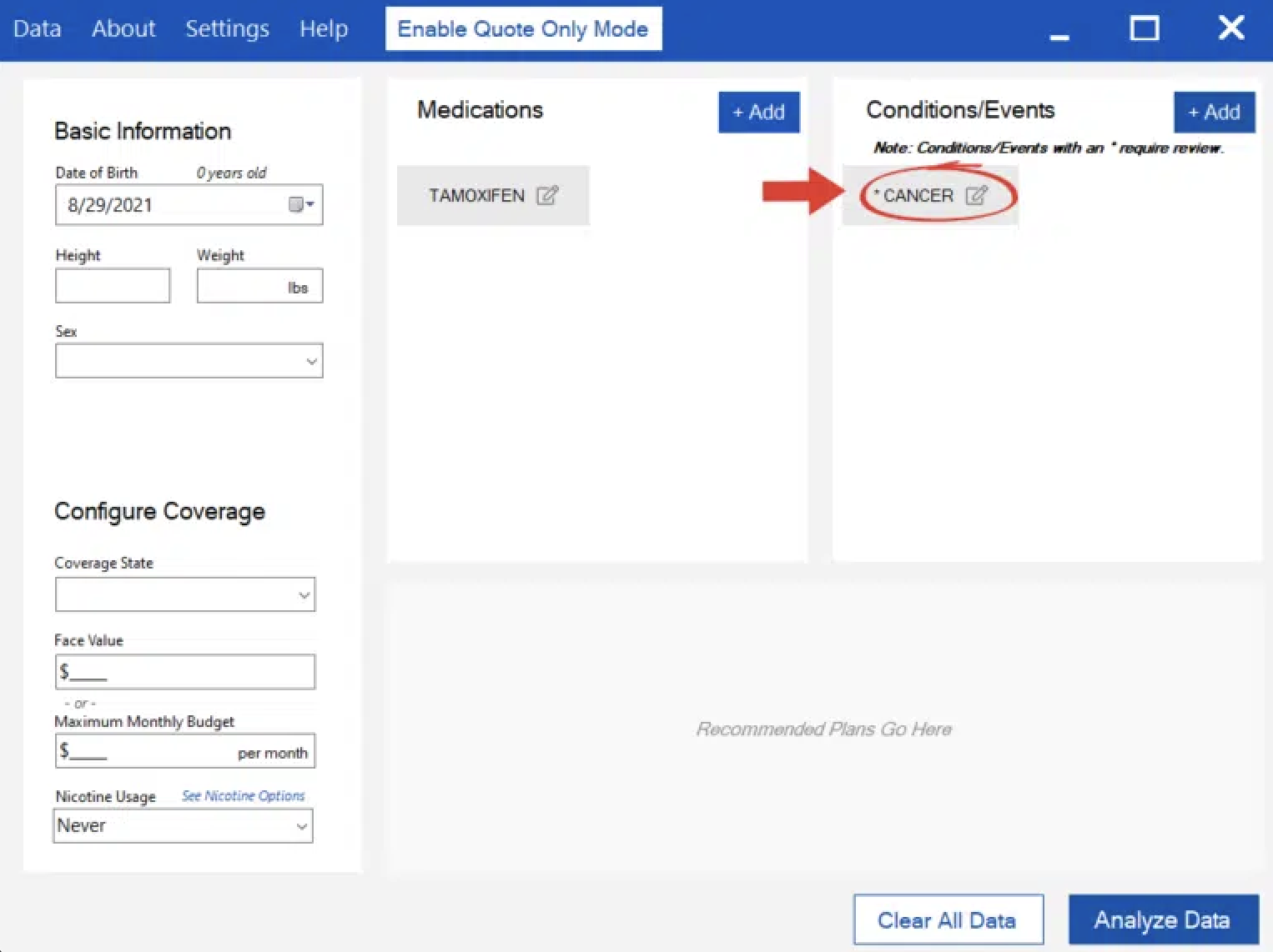 If your client doesnโt have medications to report, you can still add conditions using the same process. Open the Health & Underwriting Wizard and start typing a condition into the Name field. Once again, our software will start predicting the condition.