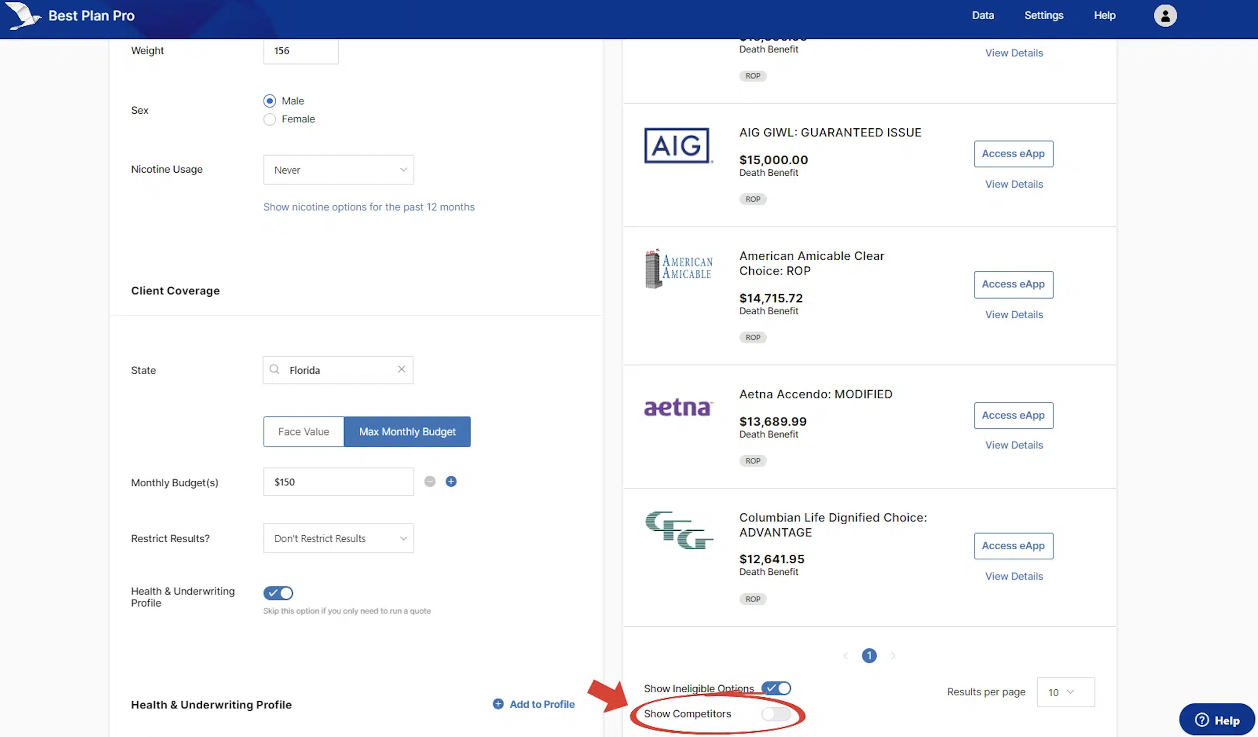After you run an analysis in Best Plan Pro, the results will appear on the right side of the window. If you scroll down, you will see an option called Show Competitors. Toggle this on to have the results for all of the plans in BPPโs database that match the search criteria.