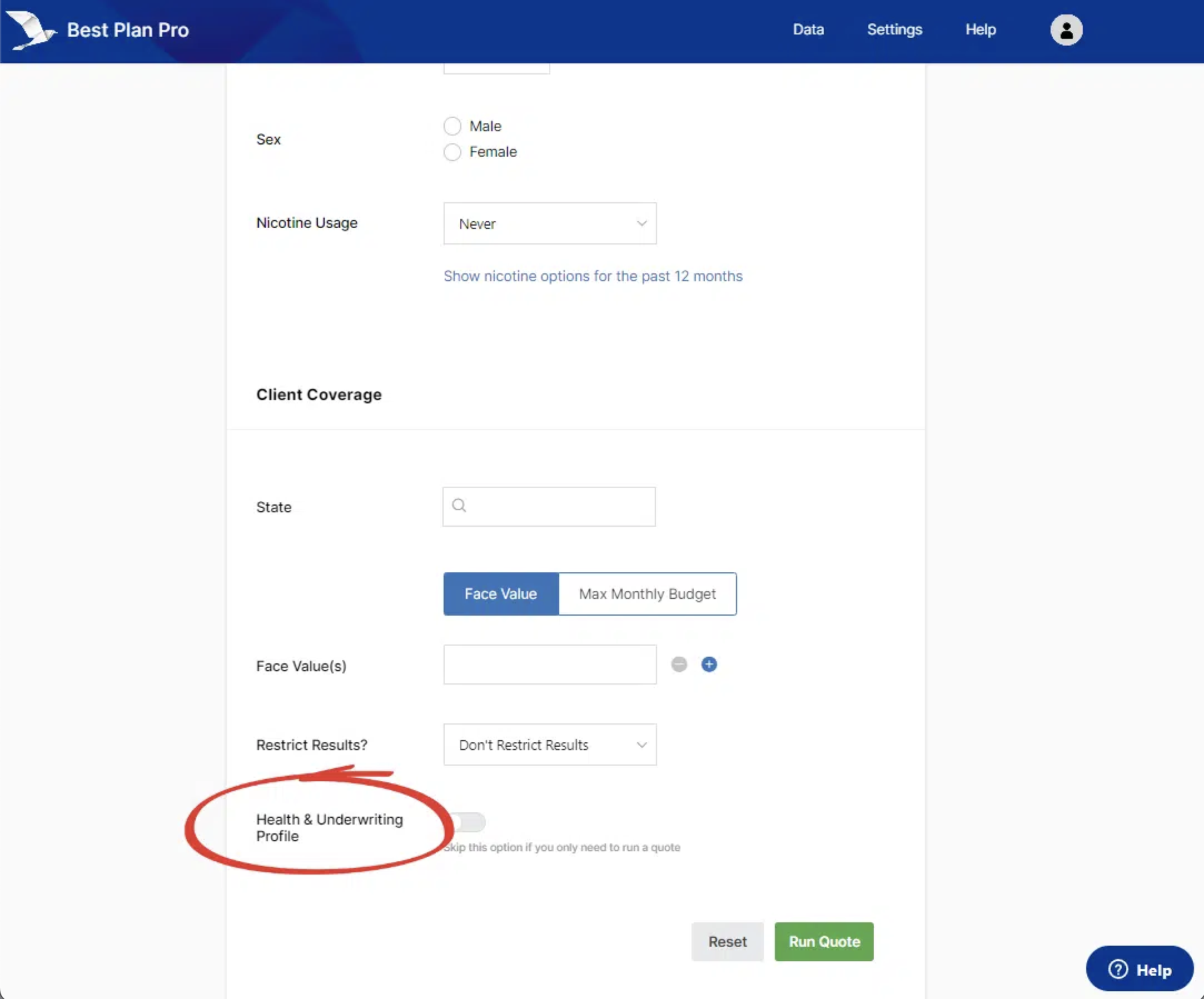 In Best Plan Pro 2.0, make sure the Health & Underwriting Profile toggle switch is off. As long as this option is toggled off, then the analysis will be run in Quote Only Mode.