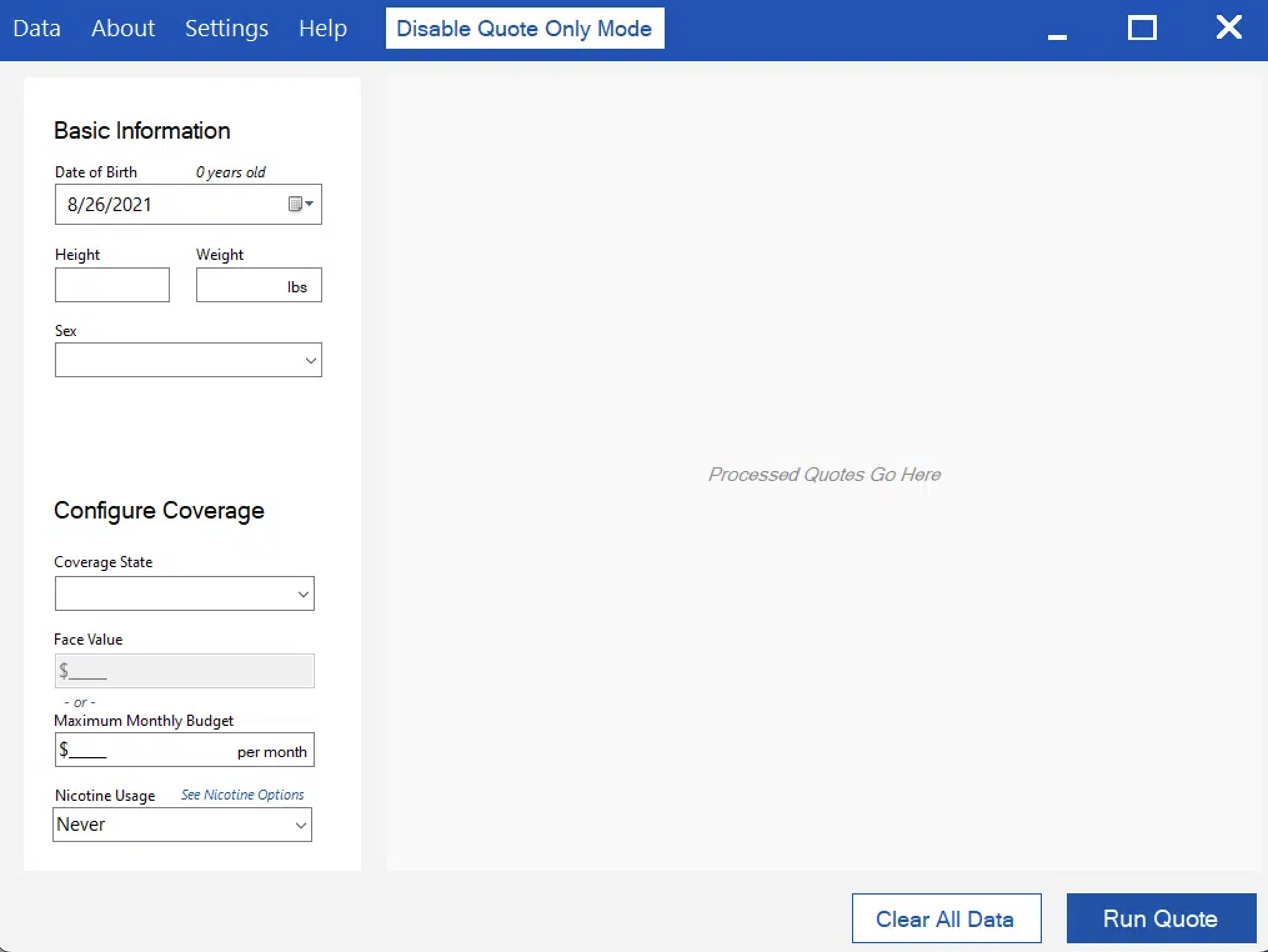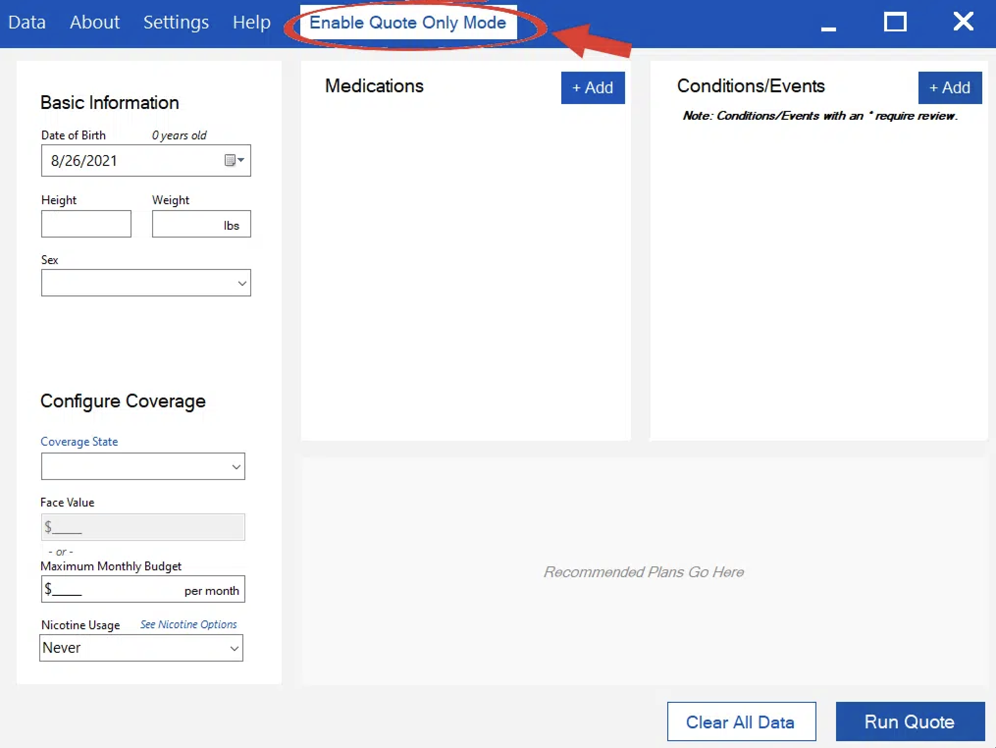 Quote-only mode ignores any supplied medications & conditions. However, it does not ignore the Basic Information & Configure Coverage sections. You can still run multiple quotes, check the budget, and refine nicotine options. This is best used when you know someone is going to qualify for coverage, you just need a more nuanced quote. This is usually combined with the restrict results feature.