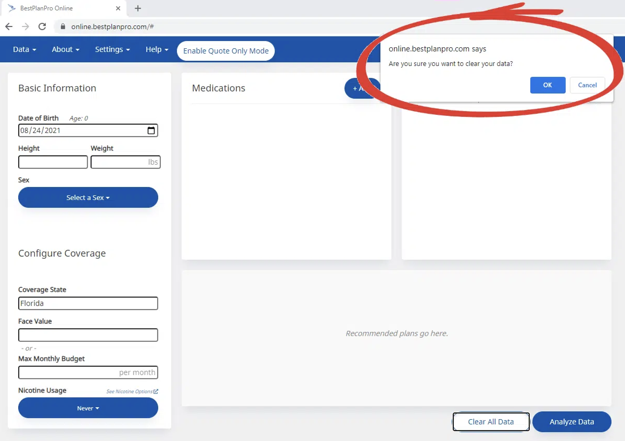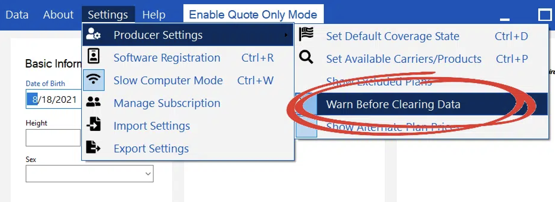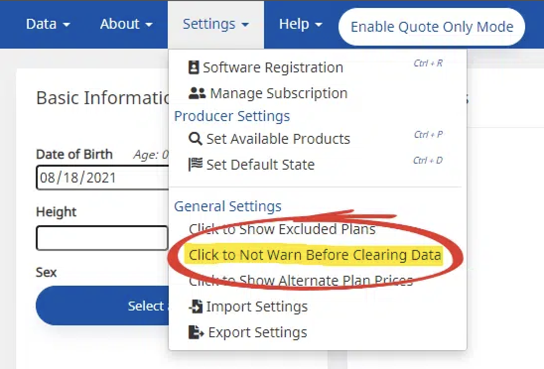 In Best Plan Pro, you can disable/enable the Clear Data Warning prompt when clearing your search data parameters. The prompt is turned on by default.