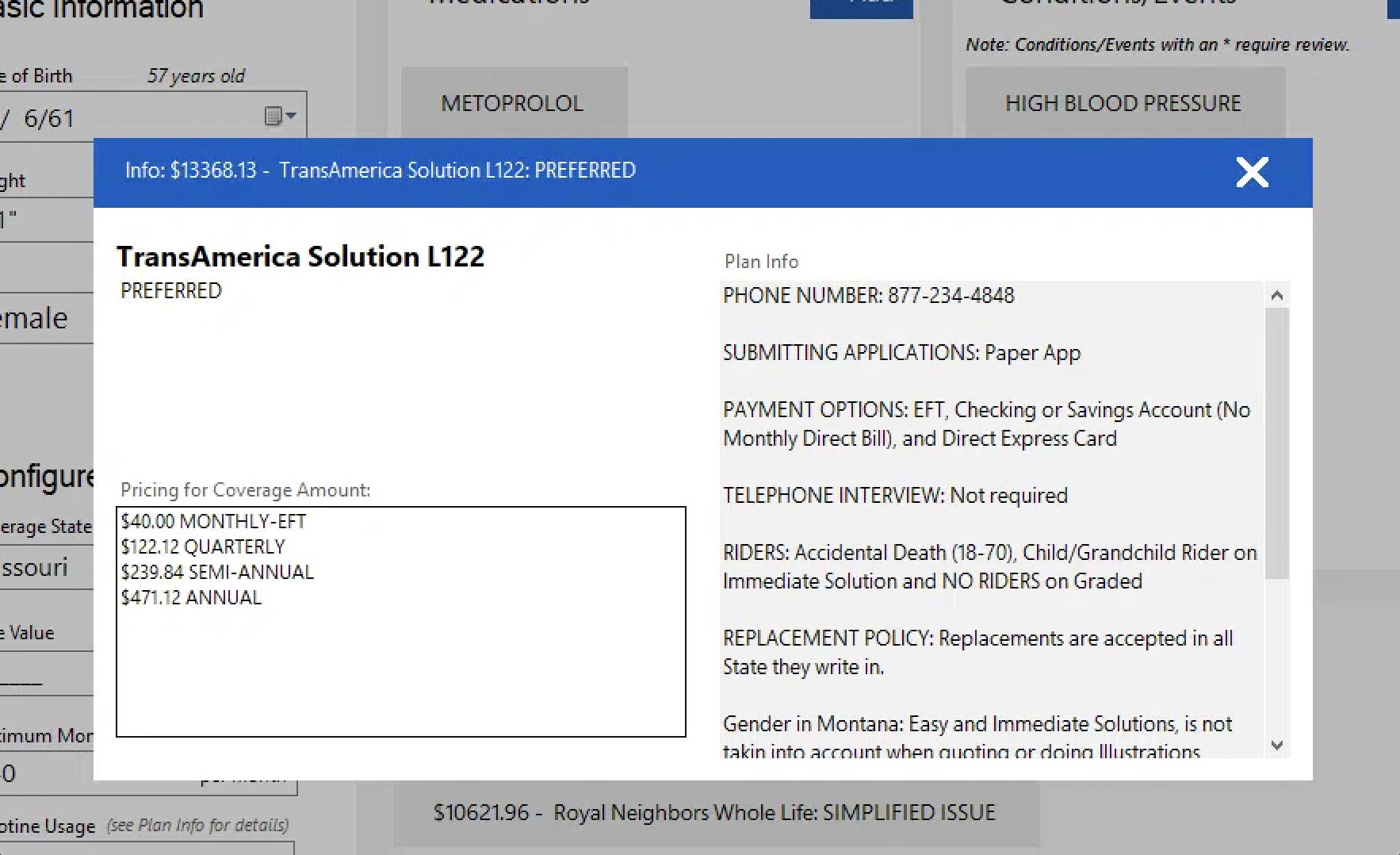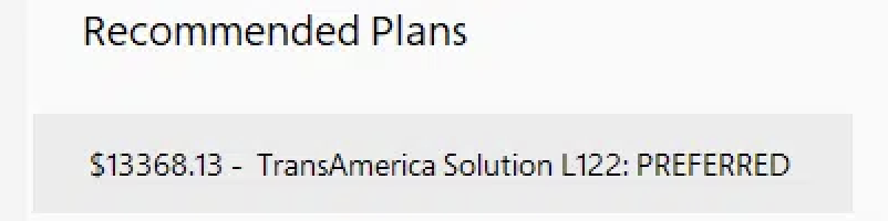 That means your client can afford a TransAmerica Preferred Plan with a face value of $13,368.13 for $40/month. And when we open up the plan info window, we see just that:
