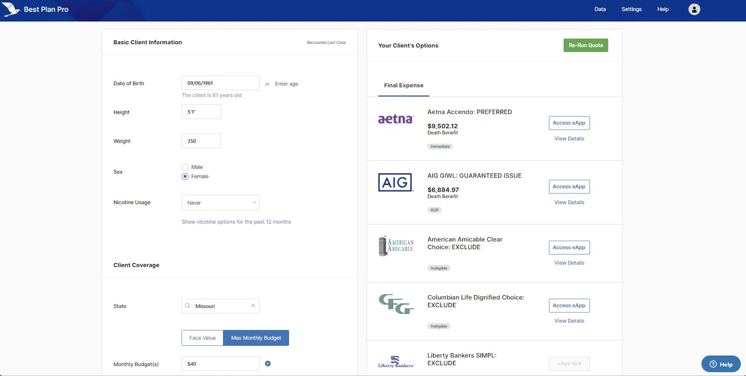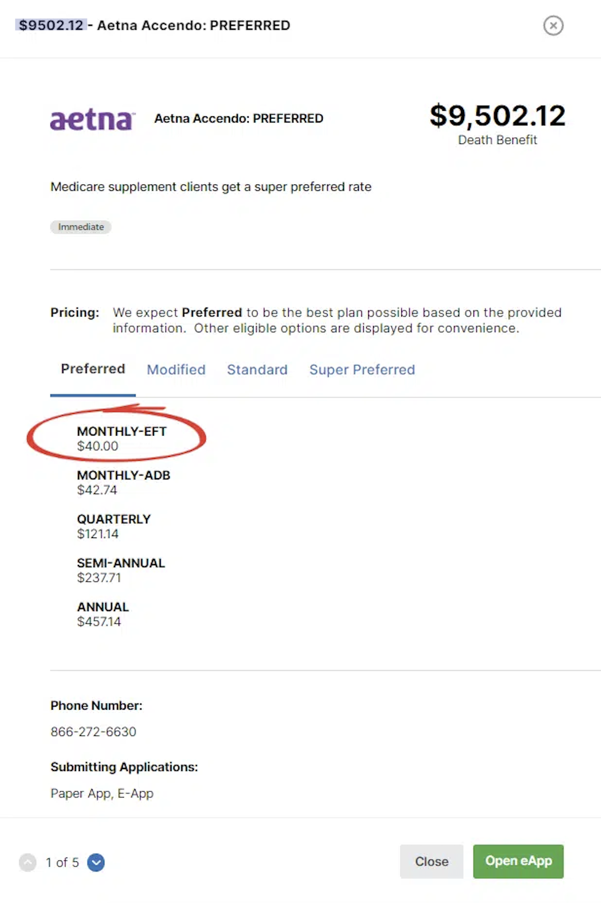 Those are the face values that your client can afford for that particular plan. So, if you see $9,502.12 for Aetna Accendo Preferred, it means that $40 using the MONTHLY-EFT payment option will give you $9,502.12.